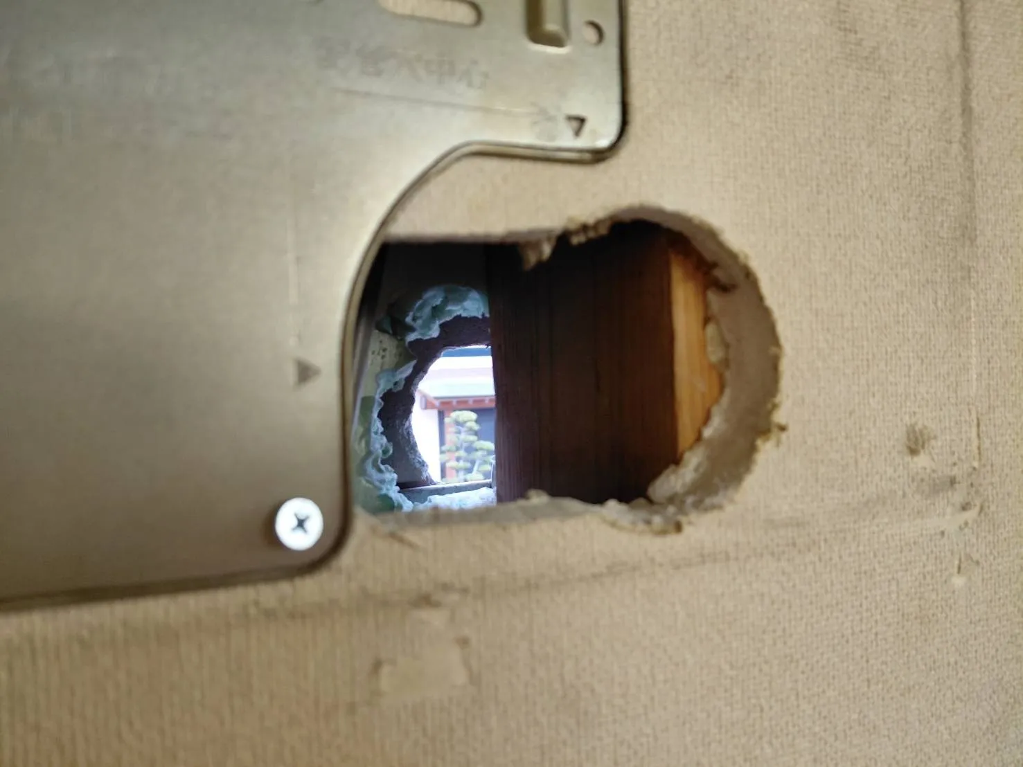 しかし取り外したら、驚きの(前任業者が下地探し無しでの、穴あけ😱) 柱を避けて、異型な壁穴‼️